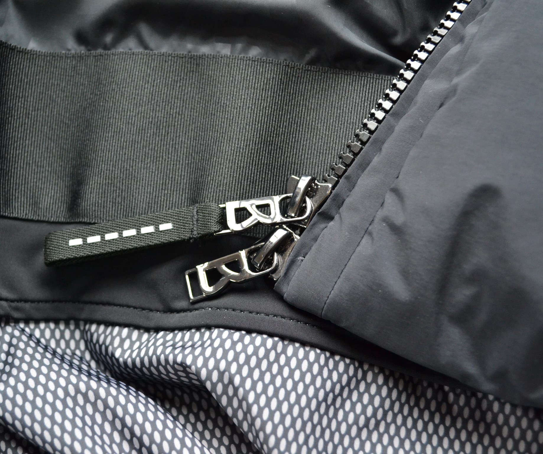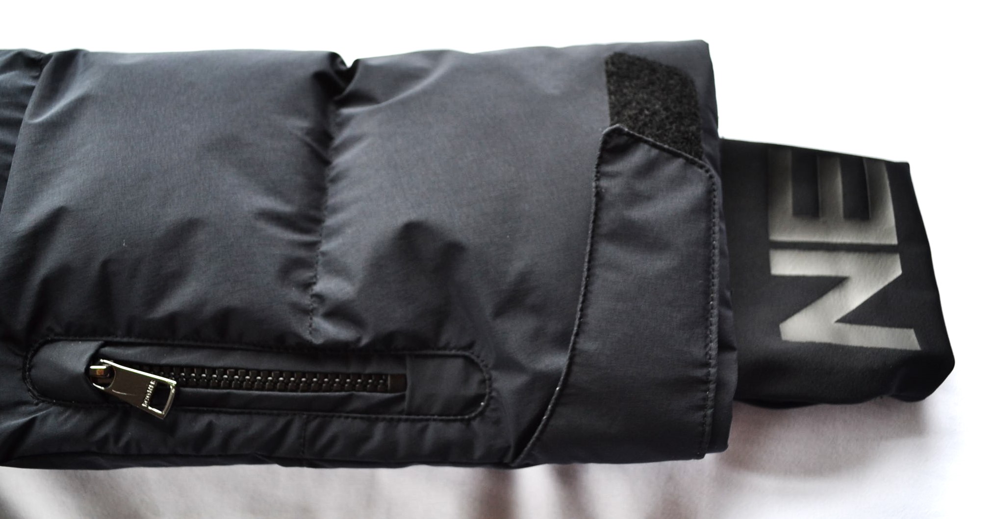 Geschlossen mit Zwei-Wege-Zipper mit Logo-Anhänger und Zippergarage, unterlegt mit Logoblende