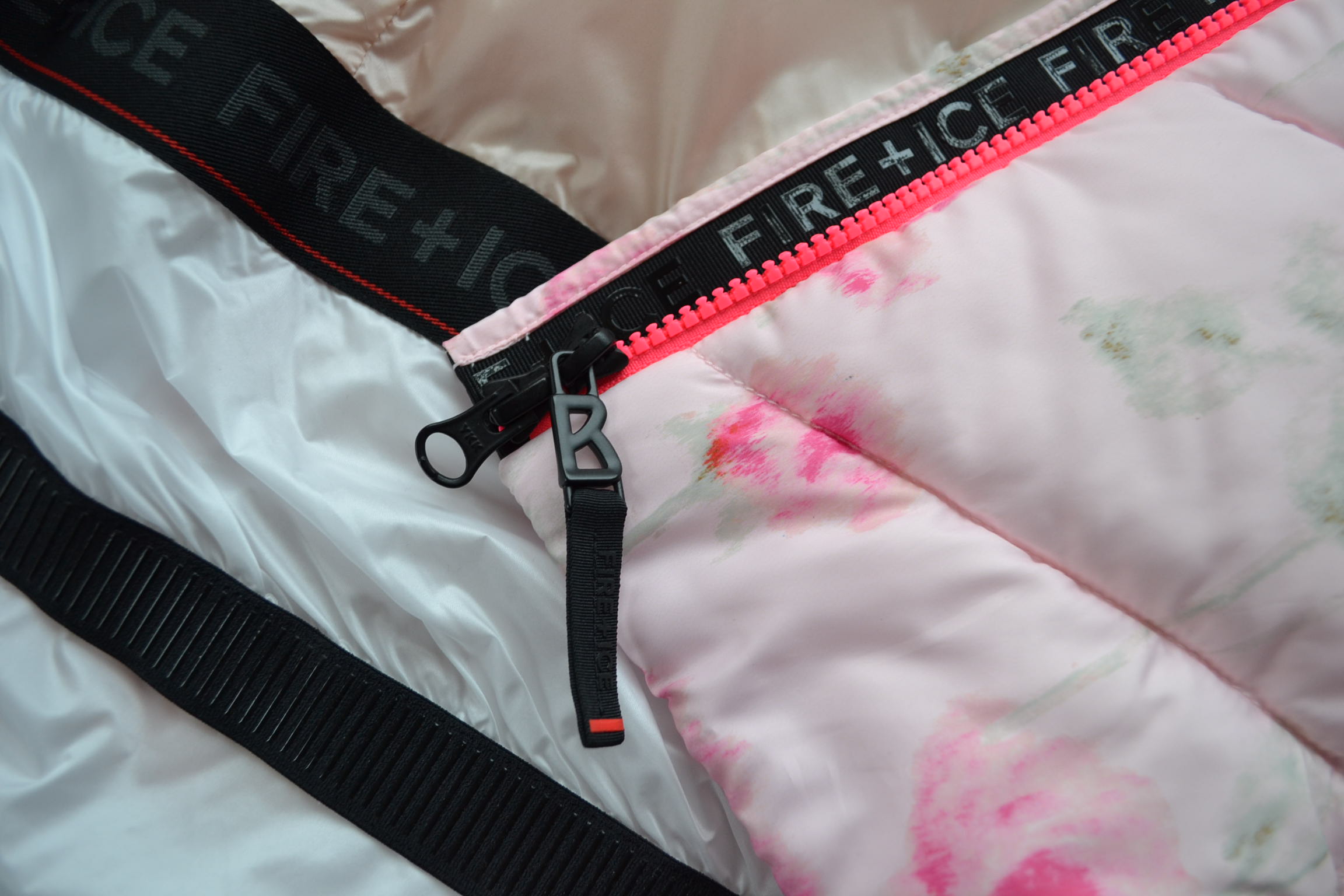 Besonders praktisch sind die zahlreichen funktionalen Details wie der Schneefang mit Druckknöpfen und die verschiedenen Taschen, darunter zwei seitliche Zipper-Taschen, eine kleine Zipper-Tasche am linken Ärmel und eine Zipper-Tasche im Rückenteil. Die elastischen Jersey-Ärmelbündchen mit Daumenloch und der weitenverstellbare Ärmelsaum mit Riegel und Druckknöpfen bieten zusätzlichen Komfort und Schutz. Ein Zwei-Wege-Zipper mit B-Logo-Anhänger und ein glänzender FIRE+ICE Print am Zipper-Untertritt runden das Design ab.
