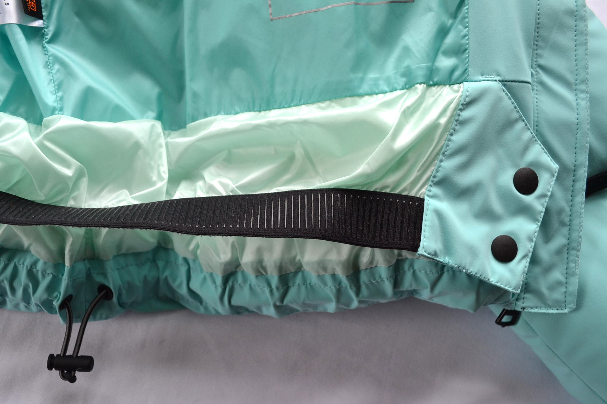 Labeltypisch elastischer Schneefang mit Druckknöpfen
