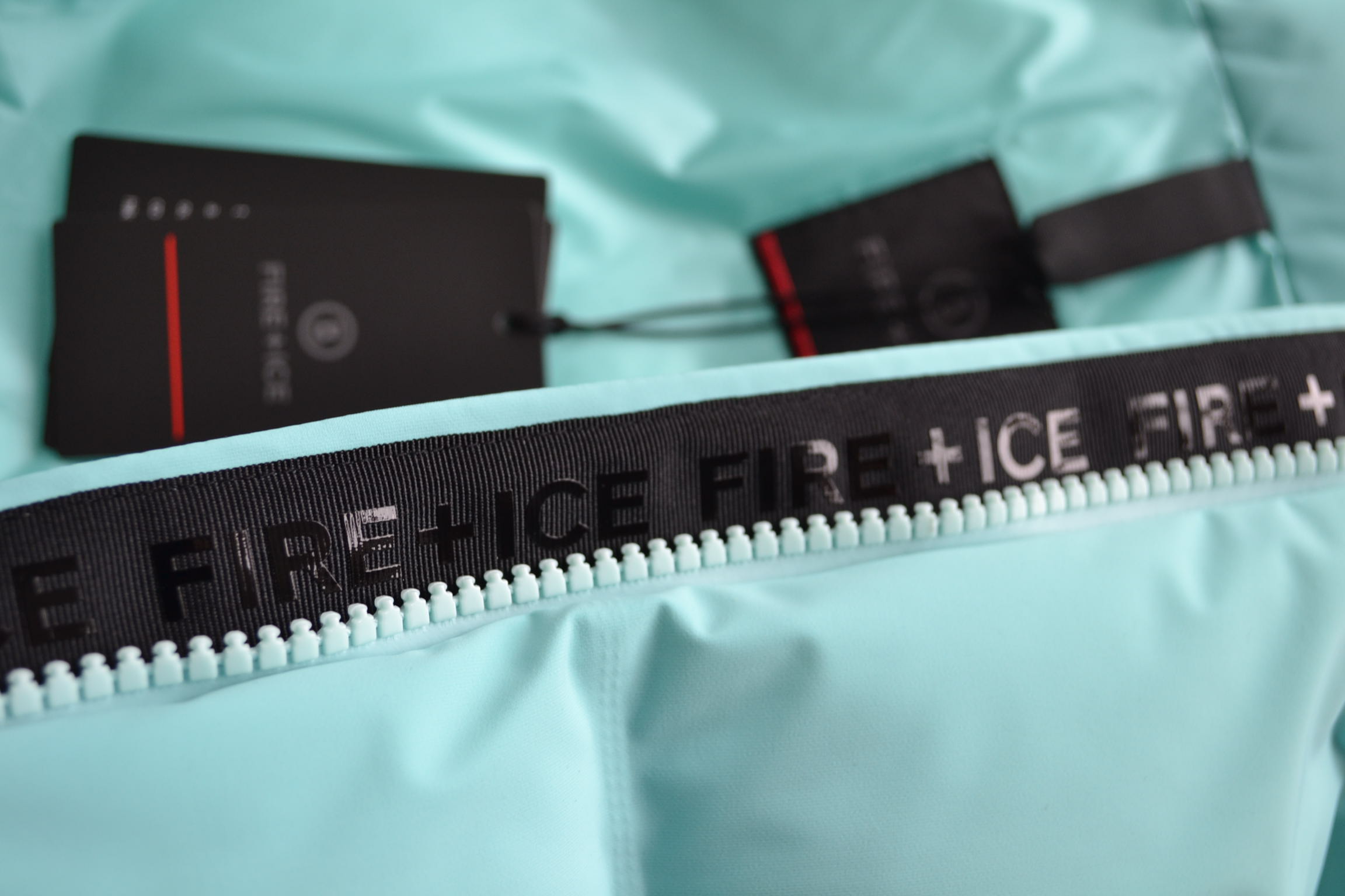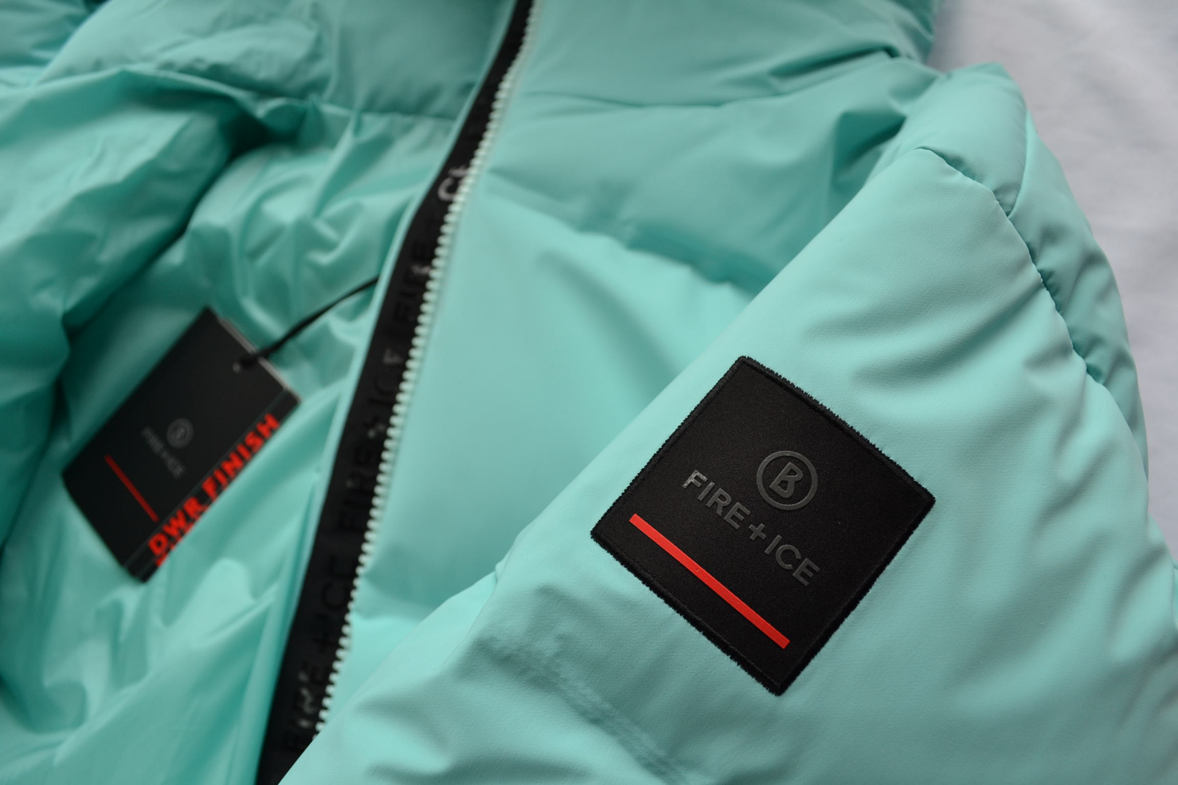 Label-Patch am Ärmel und gummierter FIRE+ICE-Schriftzug auf der Verschlussleiste