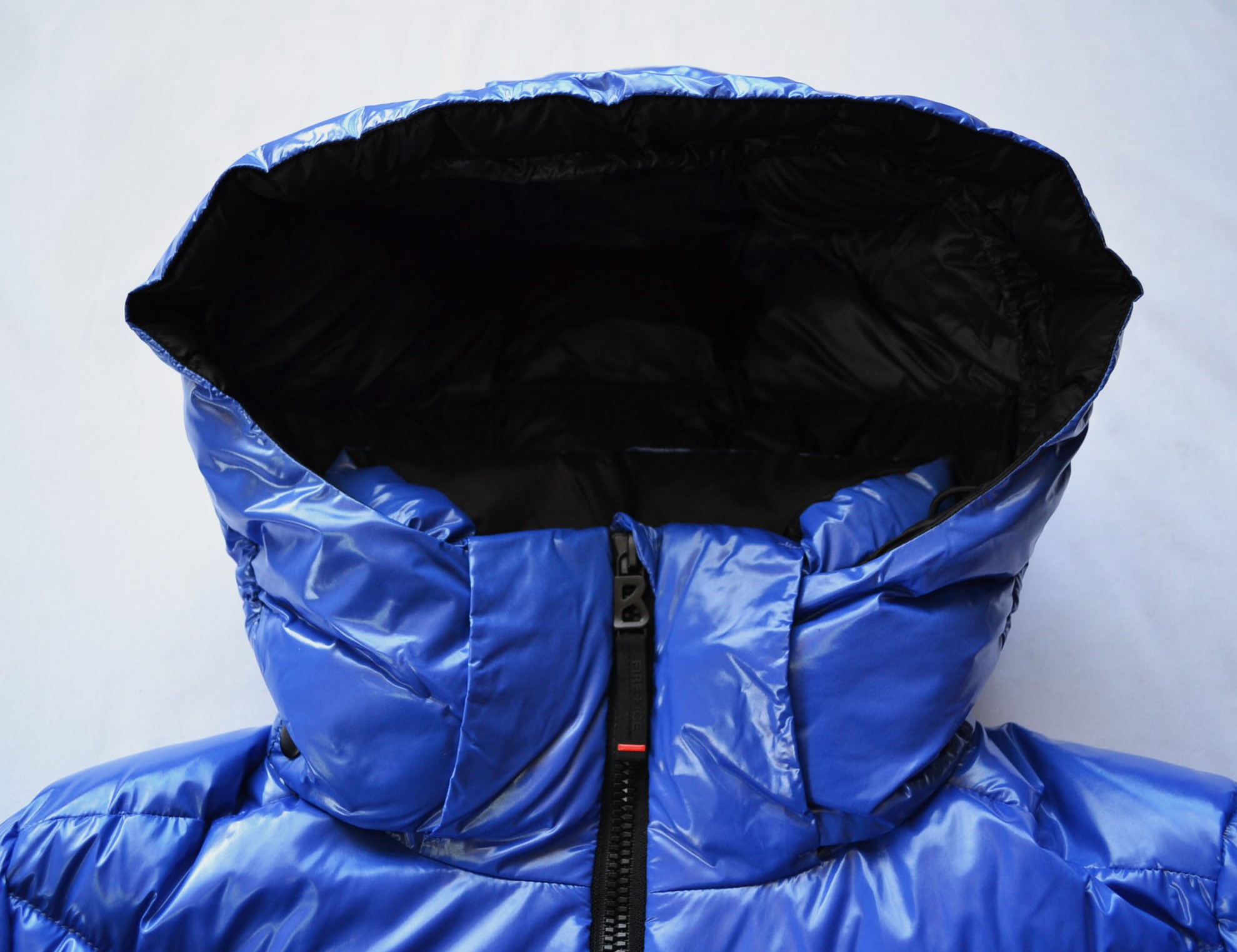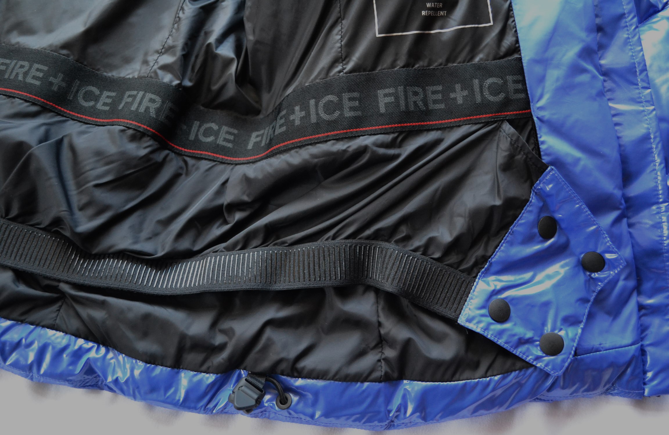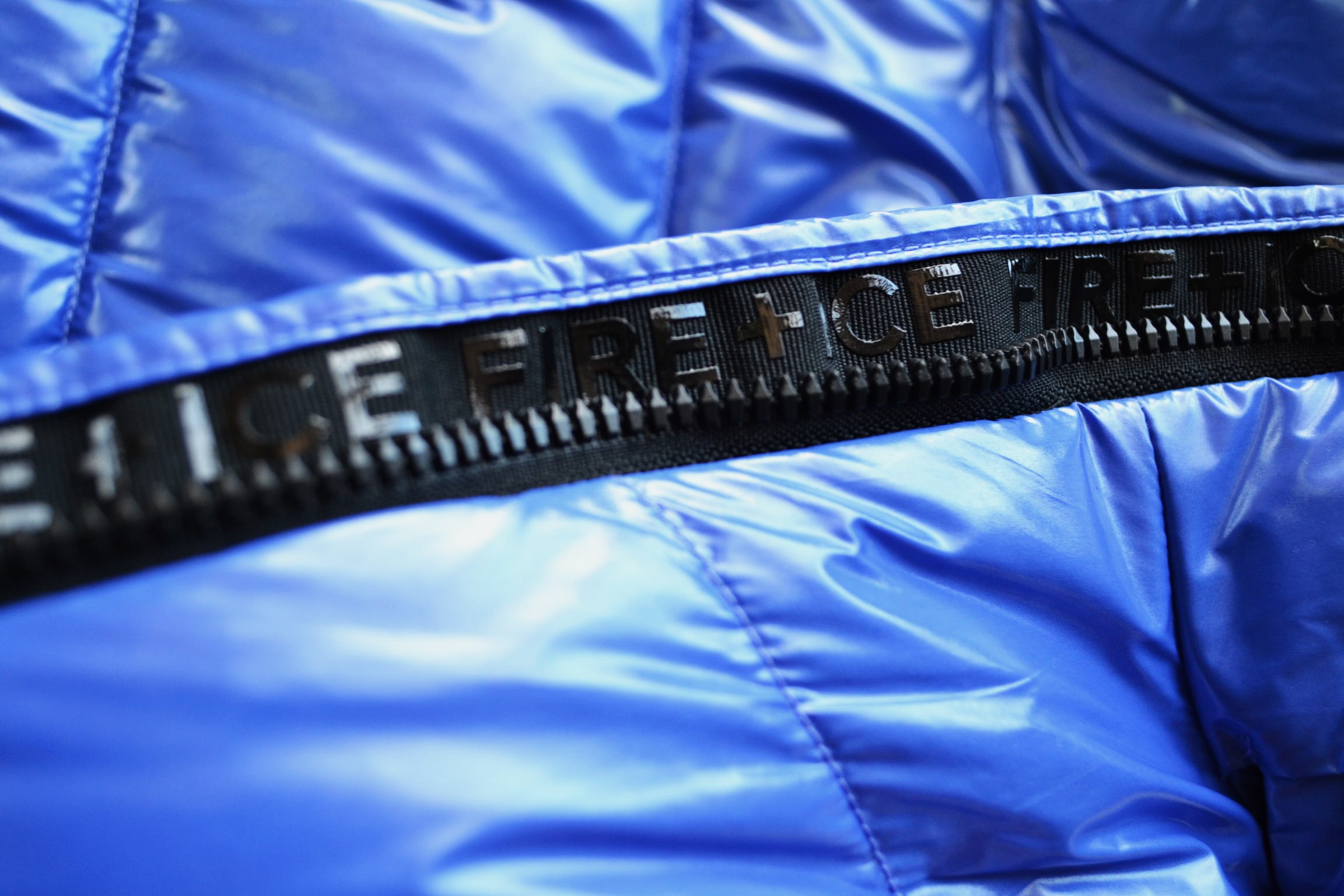 Geschlossen mit Zwei-Wege-Zipper mit B-Logo-Anhänger und Zippergarage, unterlegt mit FIRE+ICE Blende
