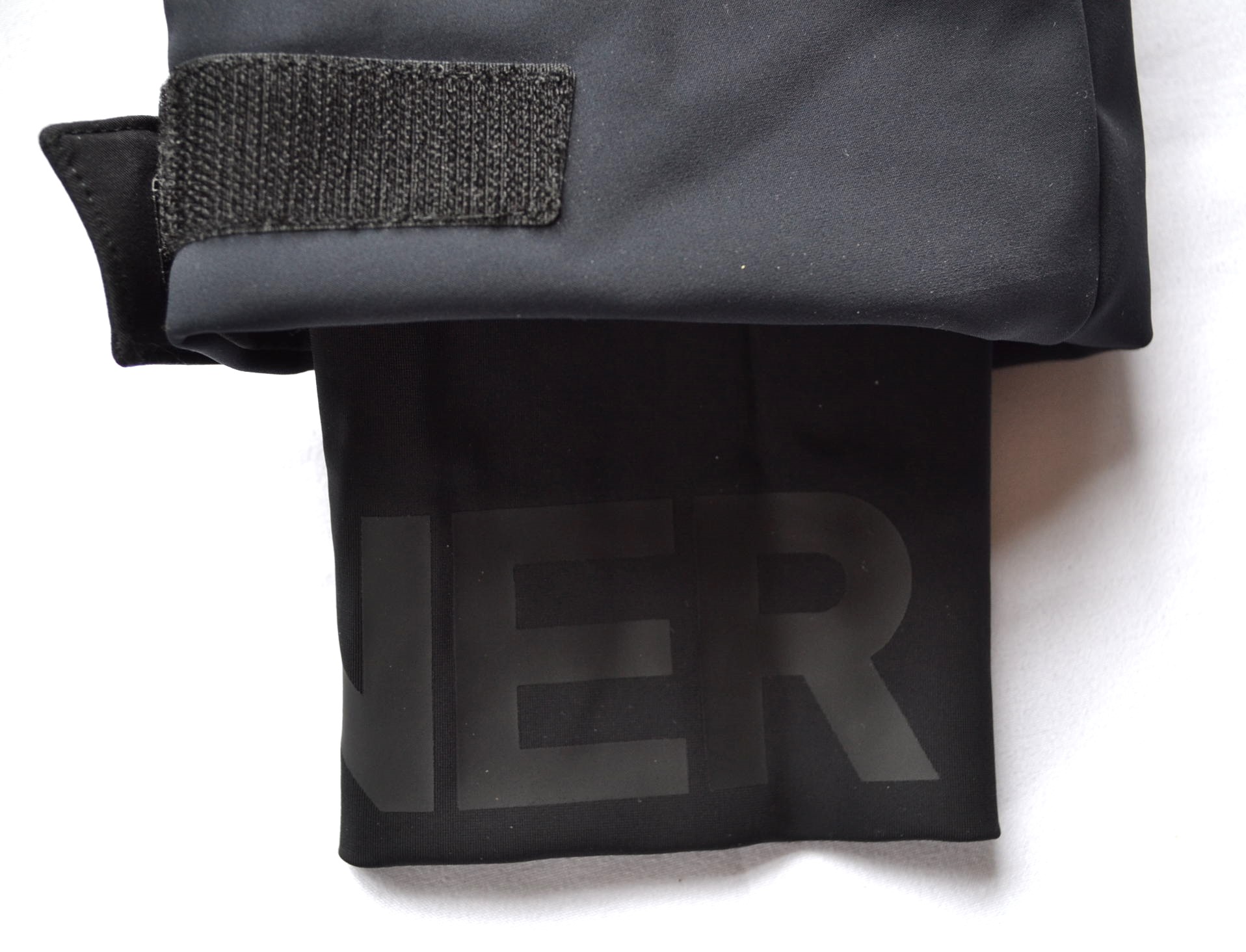 Ärmelabschlüsse mit justierbaren Klettriegeln und inwendig fixierten Daumenschlaufen im Logo-Design