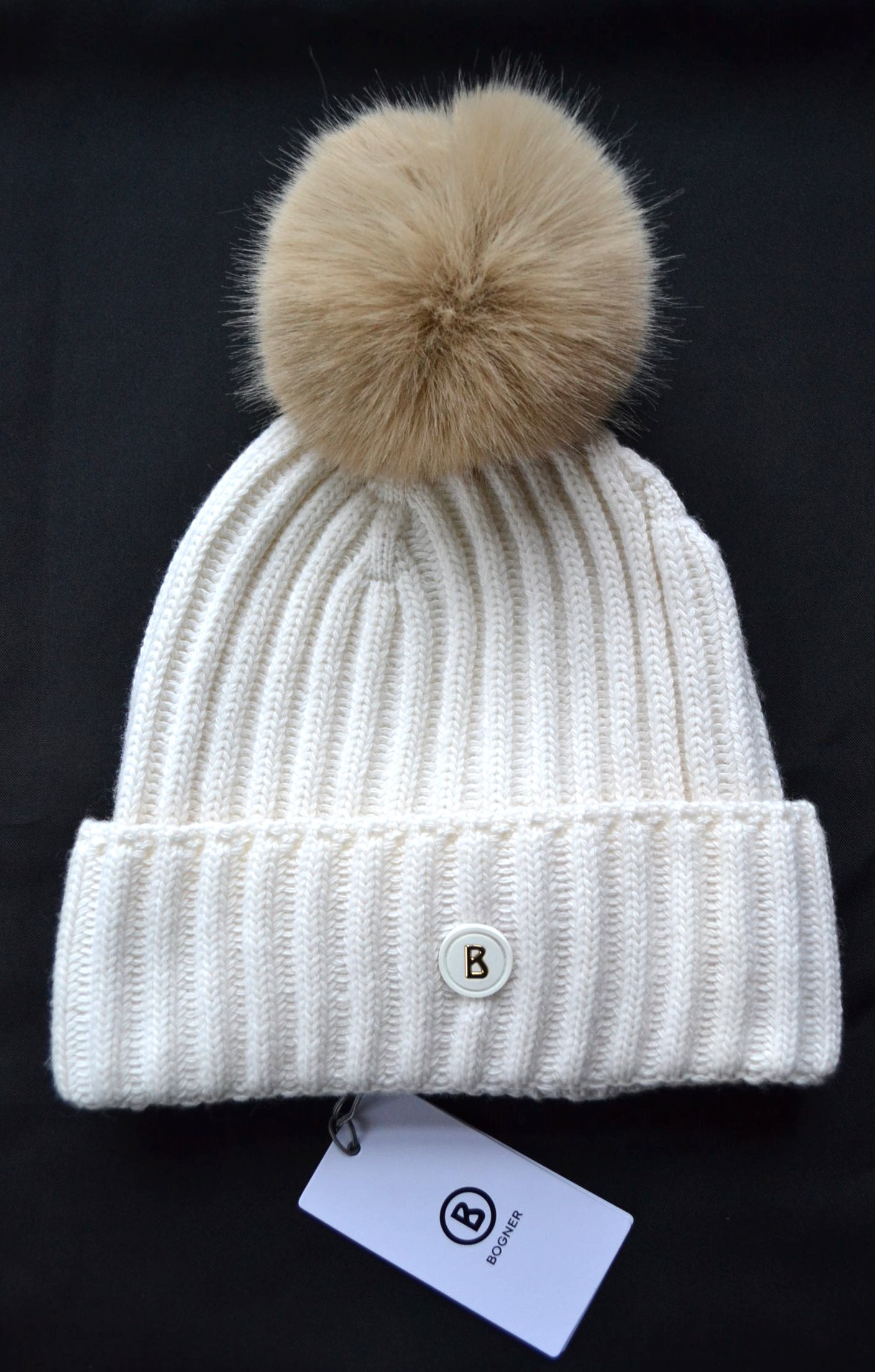 BOGNER RANYA HERREN DAMEN MÜTZE MIT LAMMFELL BOMMEL 10% KASCHMIR WOLLMÜTZE WEIß NEU