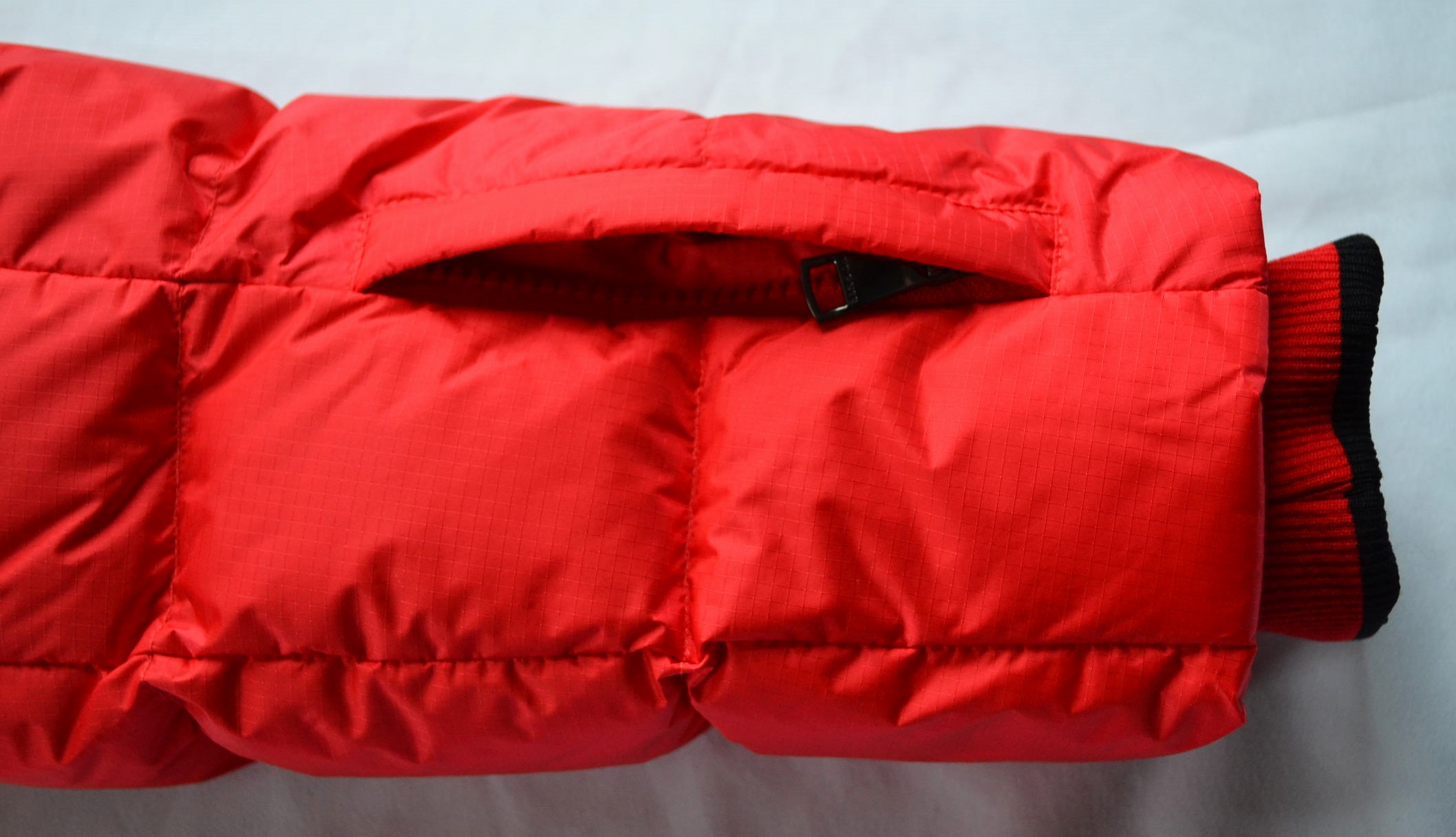 Linker Ärmel mit Rubber-Patch, Reißverschluss- und Druckknopf-Stecktasche sowie einer Skipass-Tasche