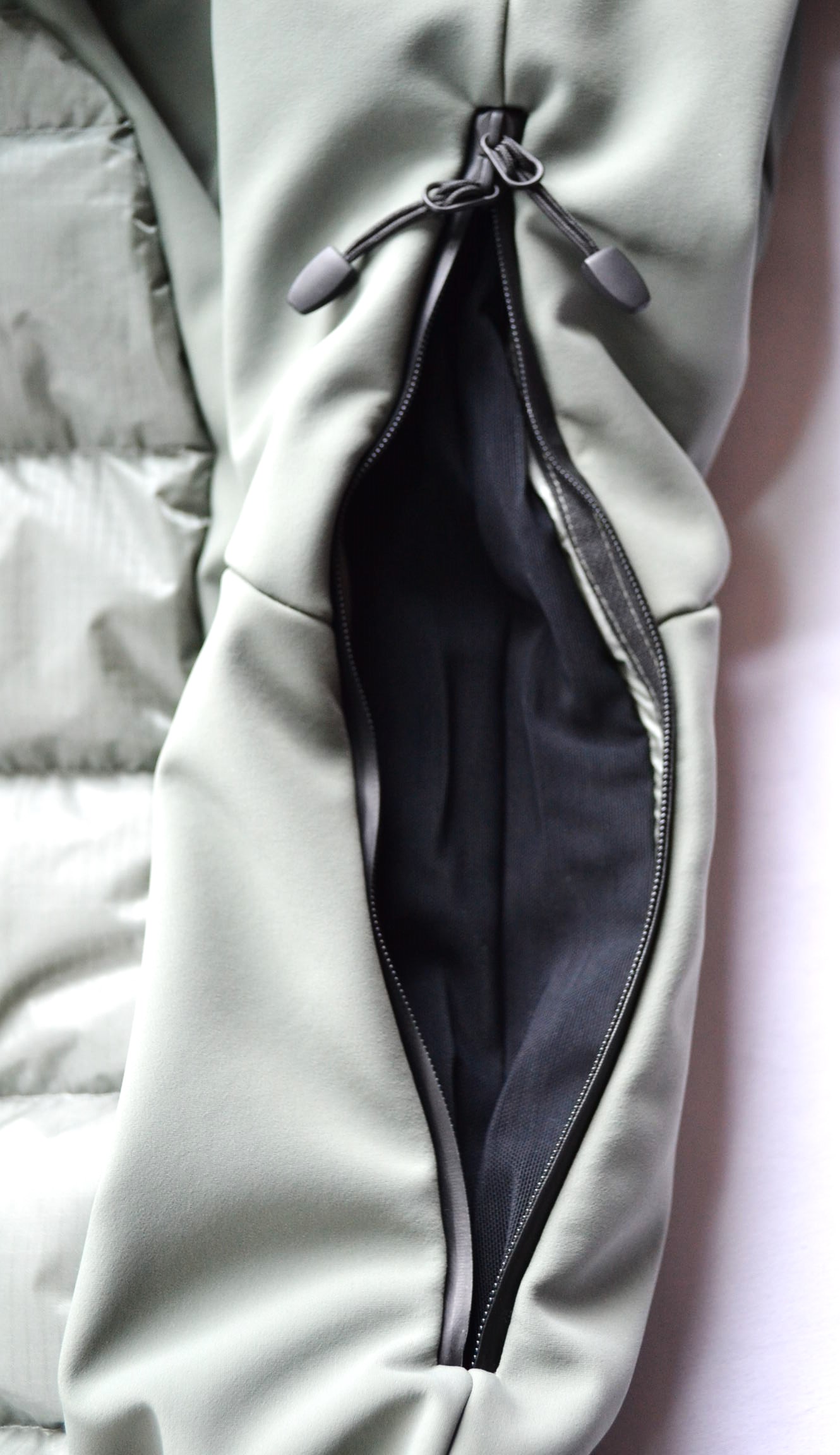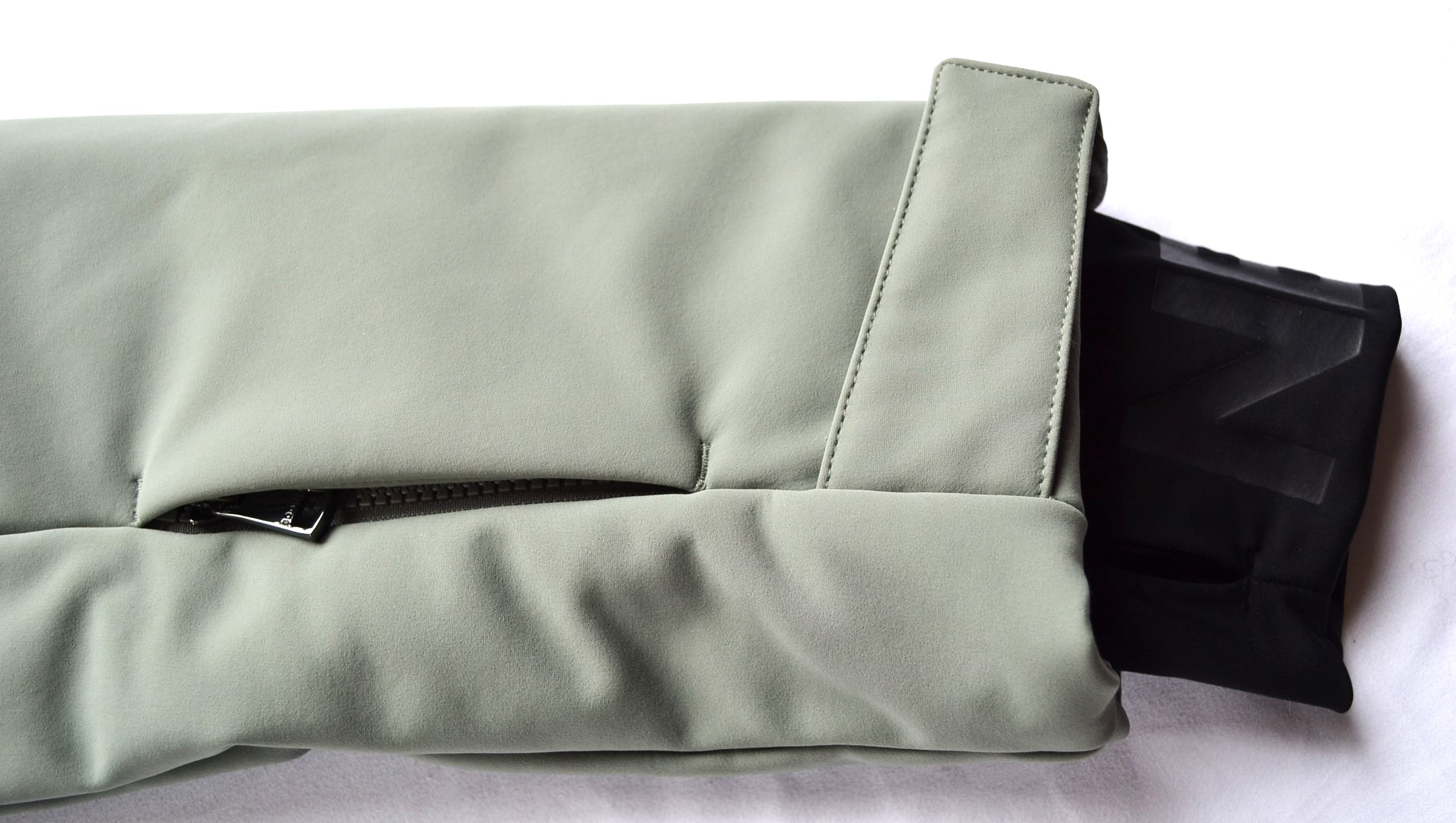 Ärmelabschlüsse mit justierbaren Klettriegeln und inwendig fixierten Daumenschlaufen im Logo-Design